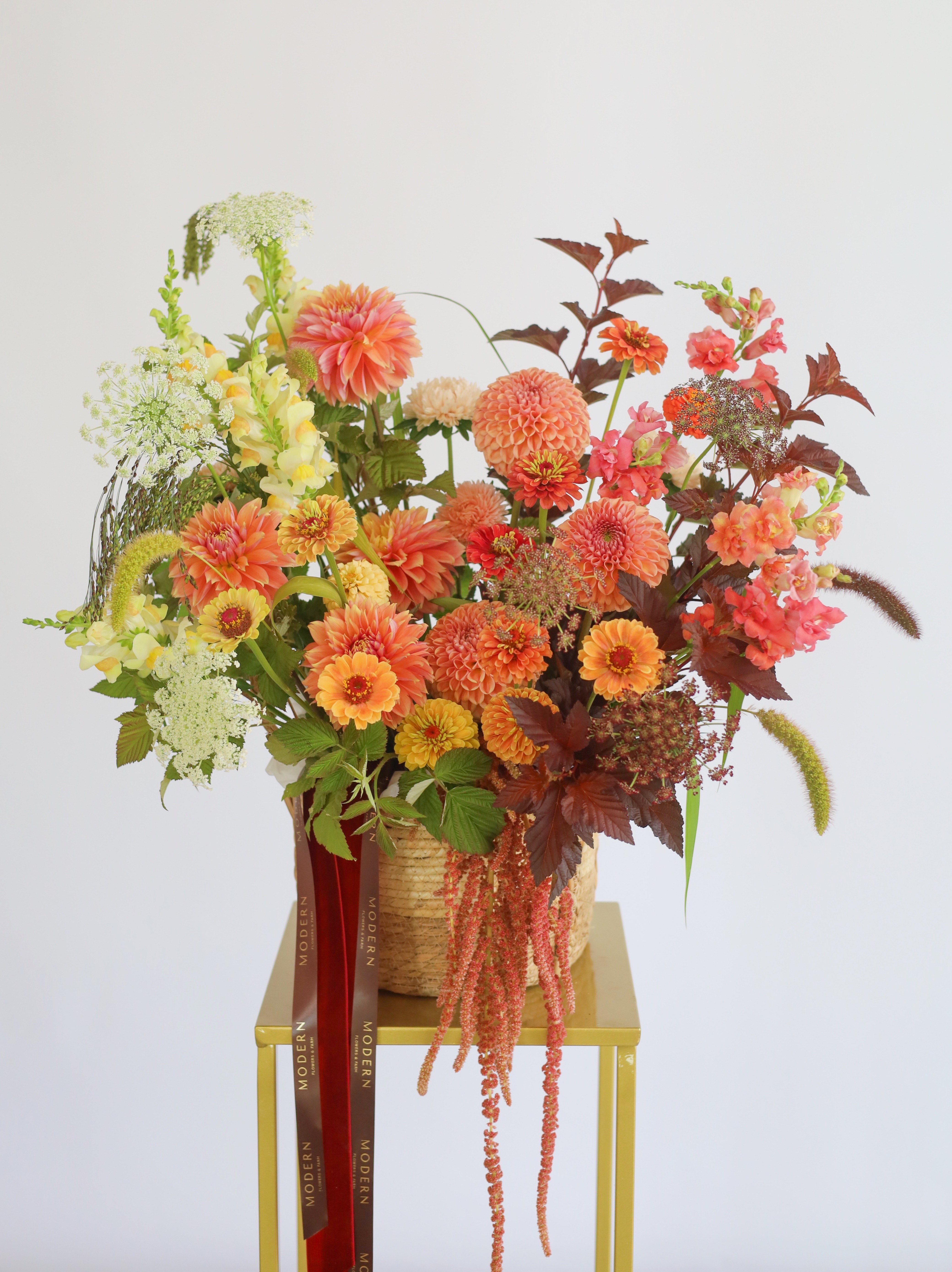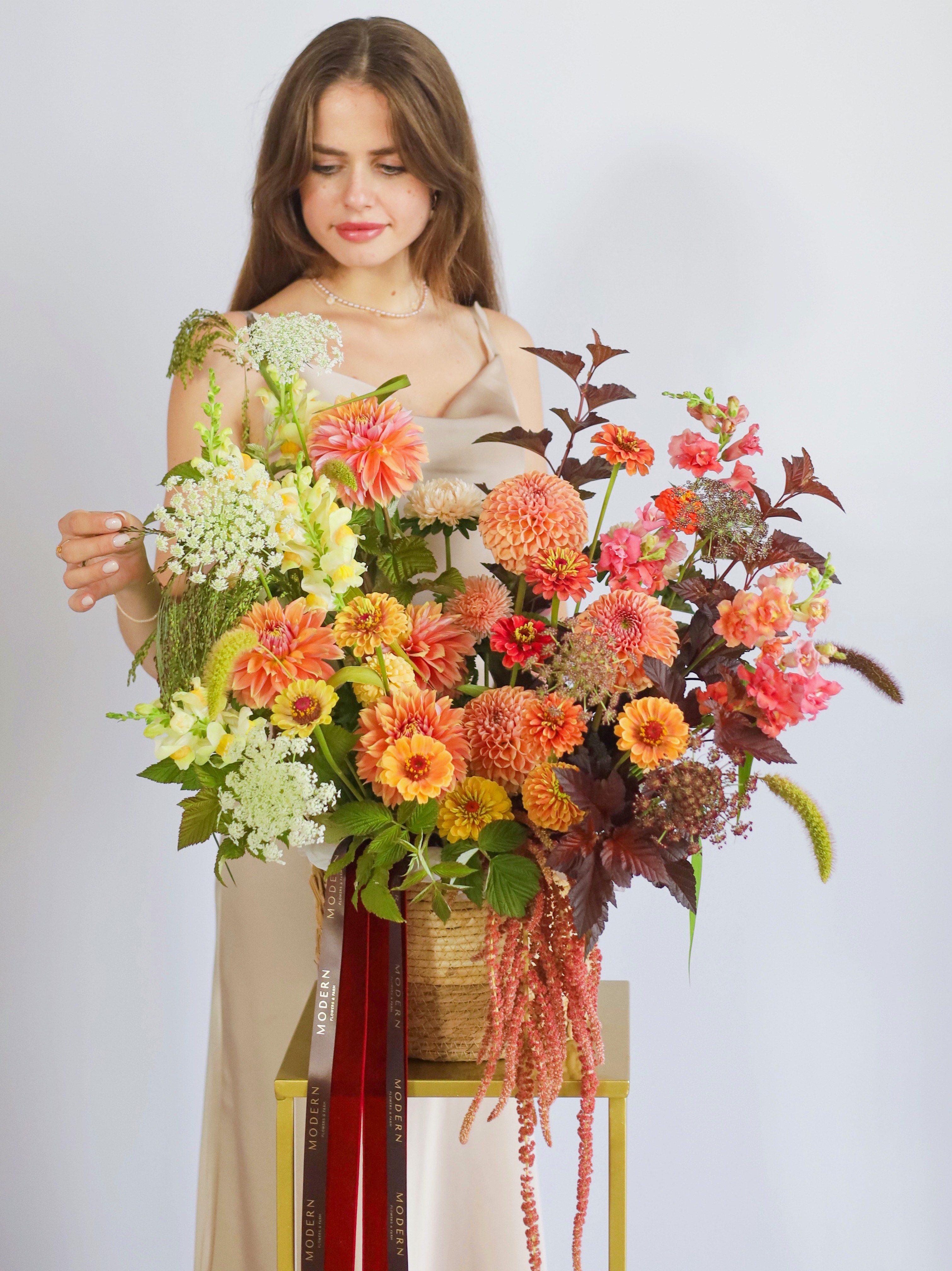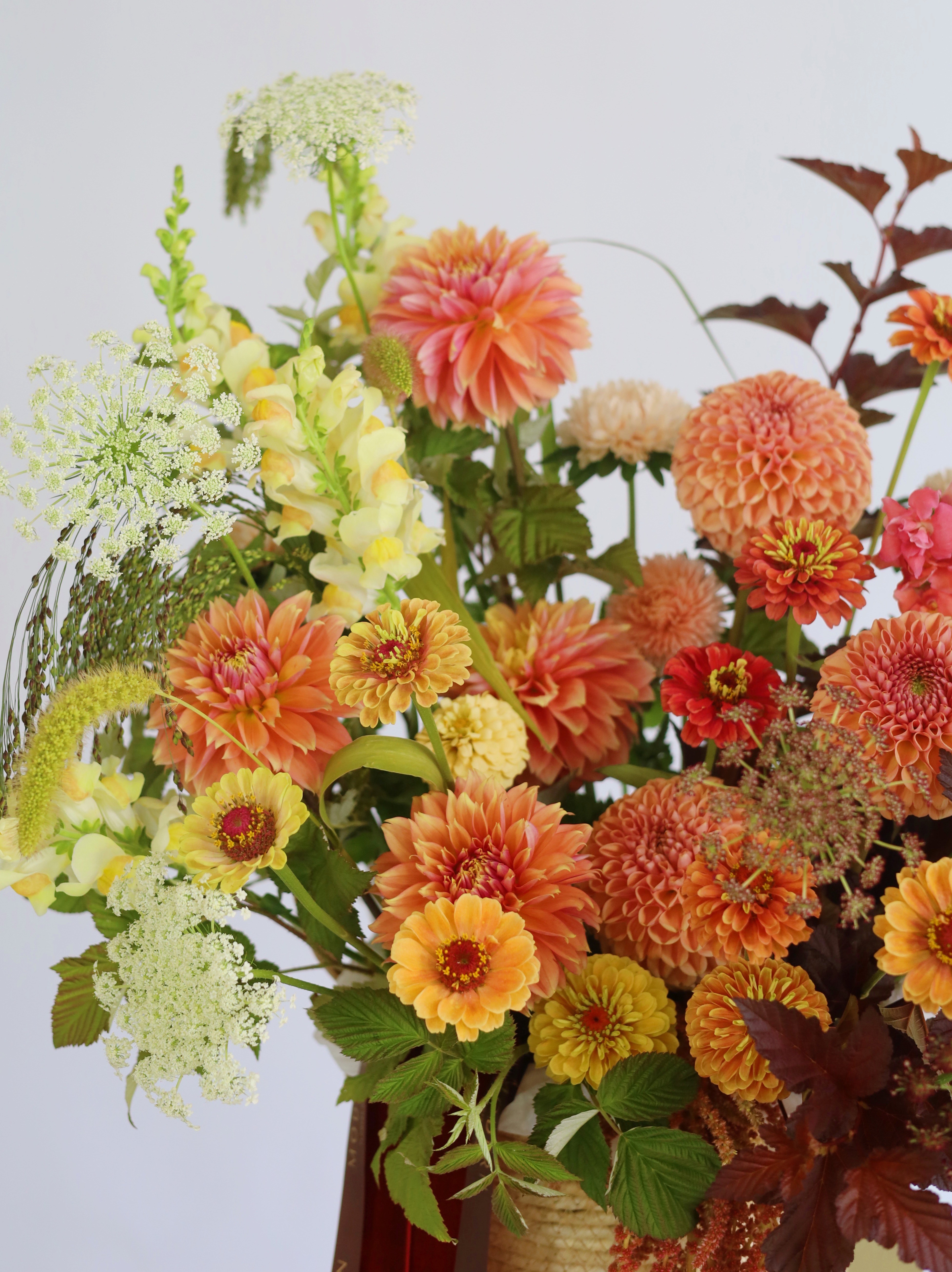 Георгины — величественные короли осеннего сада, чьи пышные соцветия создают объем и задают тон всей композиции. Их роскошные бутоны притягивают взгляд своей красотой и изяществом.