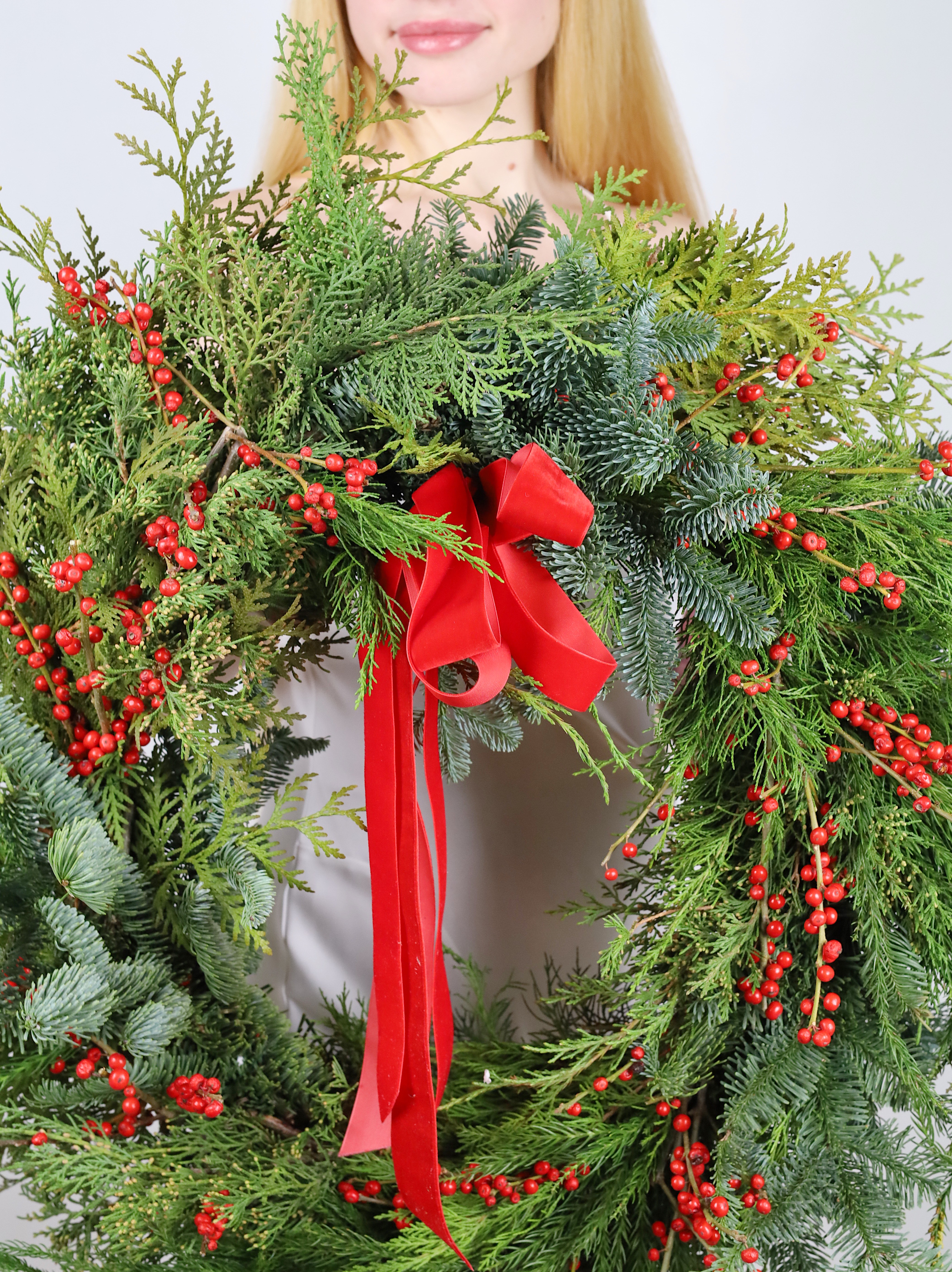 БОЛЬШОЙ ВЕНОК ИЗ МИКСА ХВОИ С ИЛЕКСОМ И БАРХАТНЫМ БАНТОМ