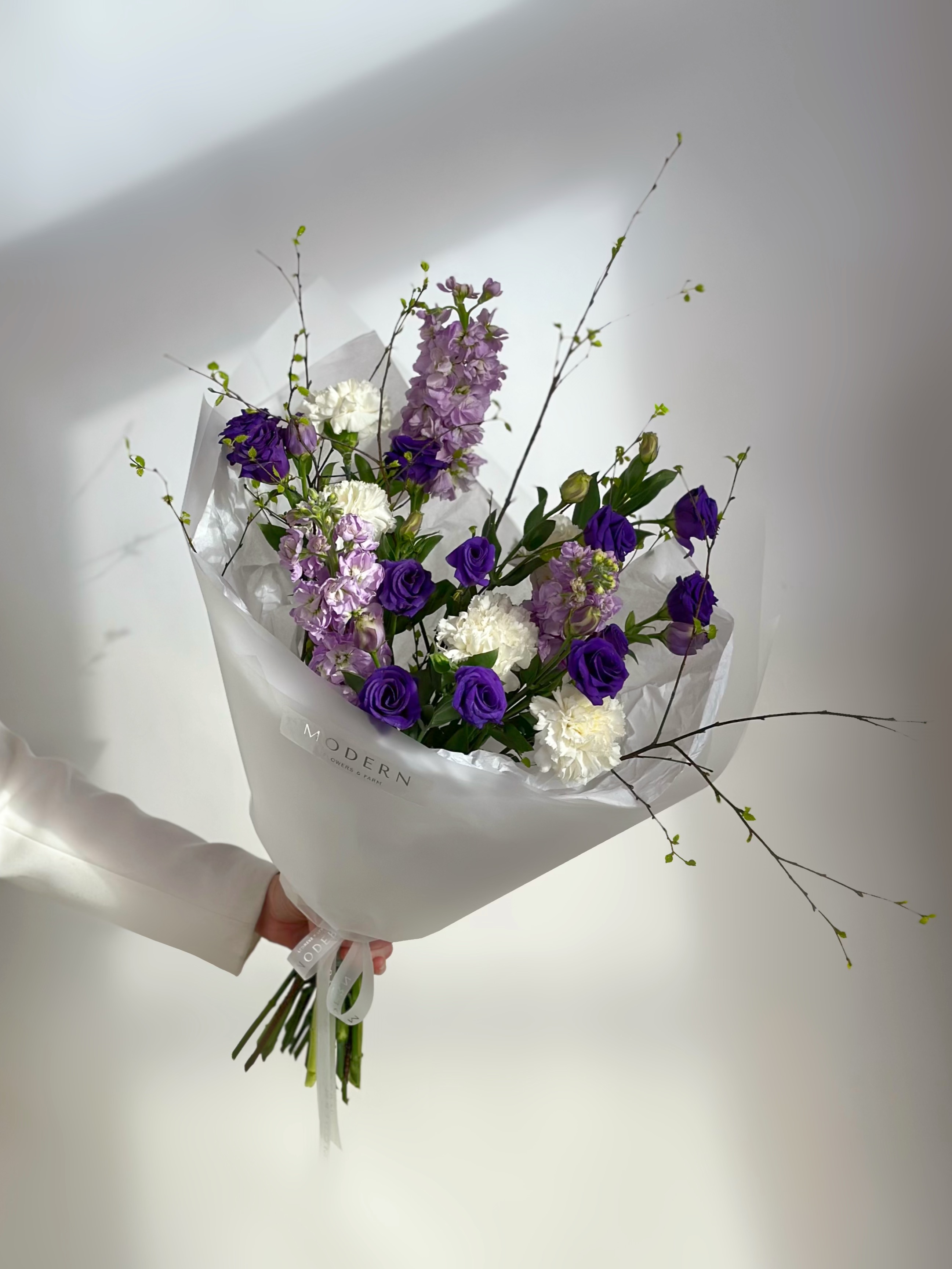 БУКЕТ С АРОМАТНОЙ МАТТИОЛОЙ, ЭУСТОМОЙ И ВЕСЕННИМИ ВЕТОЧКАМИ