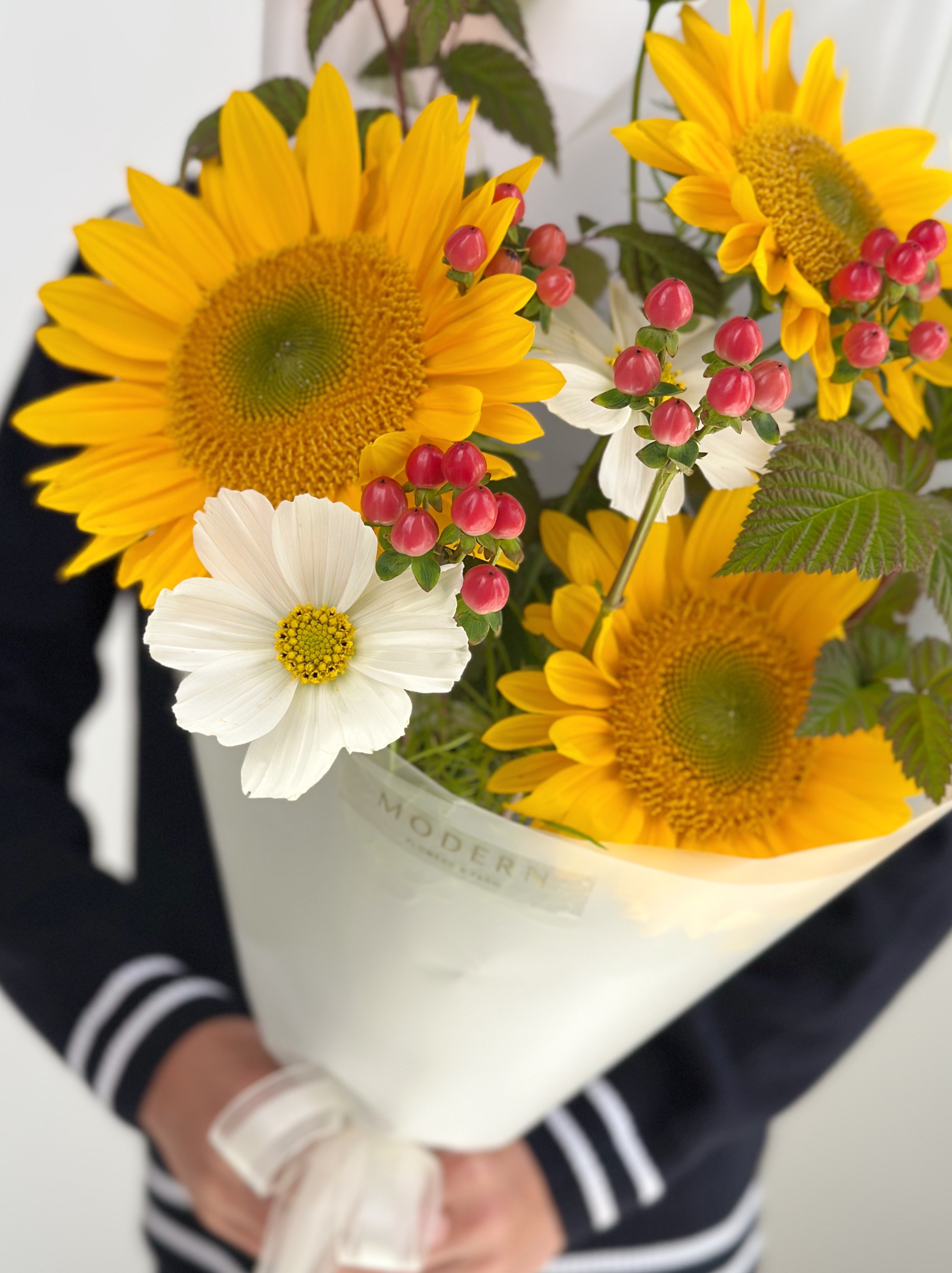 БУКЕТ С ПОДСОЛНУХАМИ И КОСМЕЕЙ