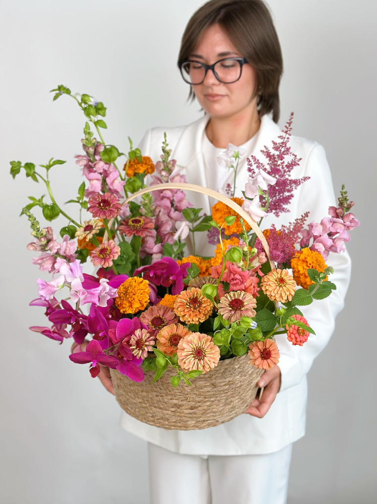 ЯРКАЯ КОРЗИНА С ЛЕТНИМИ ЦВЕТАМИ