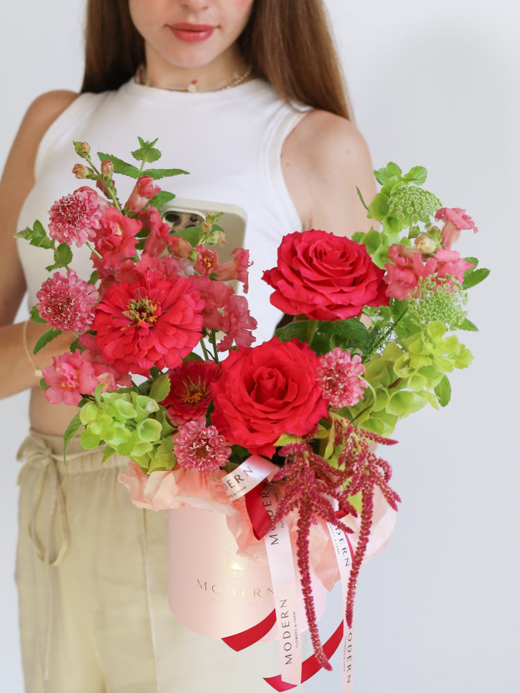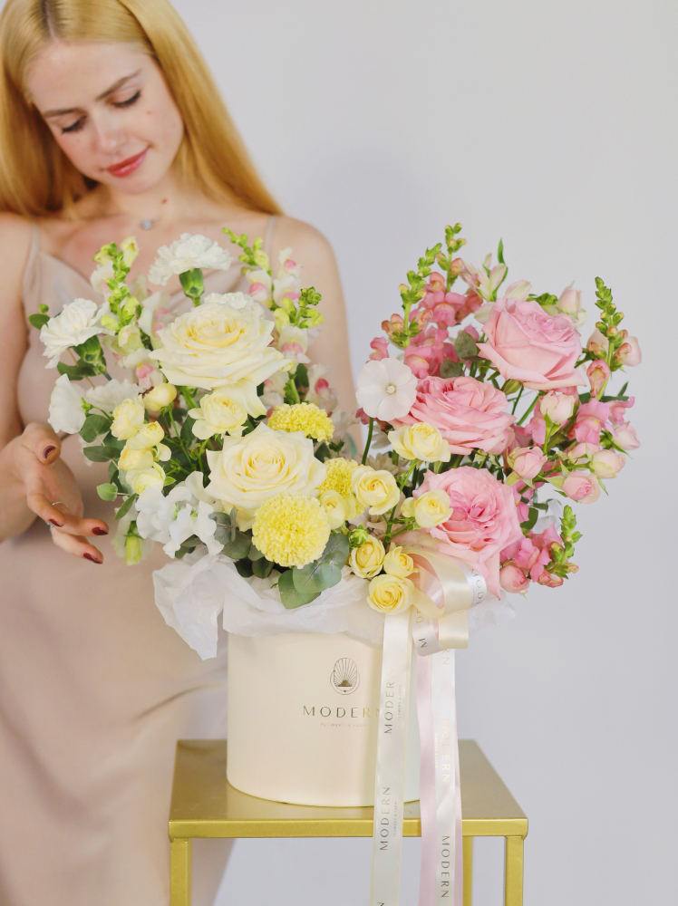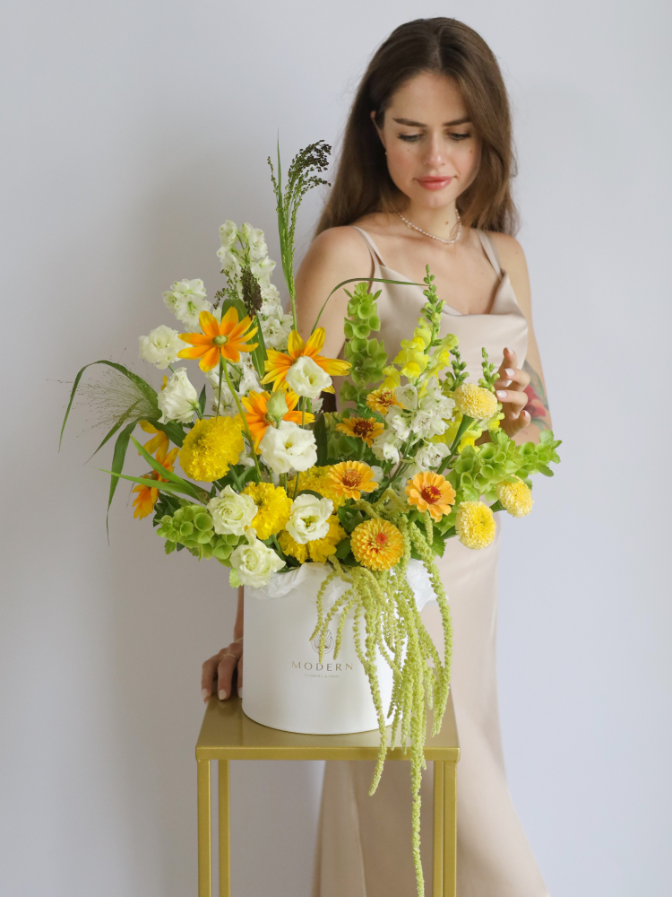 Композиция из цветов - одна из популярных категорий в онлайн-каталоге магазина Modern Flowers & Farm. Такой подарок покупают на День учителя, 1 сентября, юбилей, новоселье и т.д.