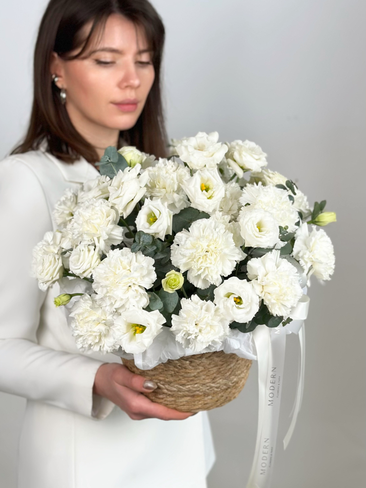 БЕЛОСНЕЖНАЯ КОРЗИНА С ЭУСТОМОЙ И ГВОЗДИКОЙ