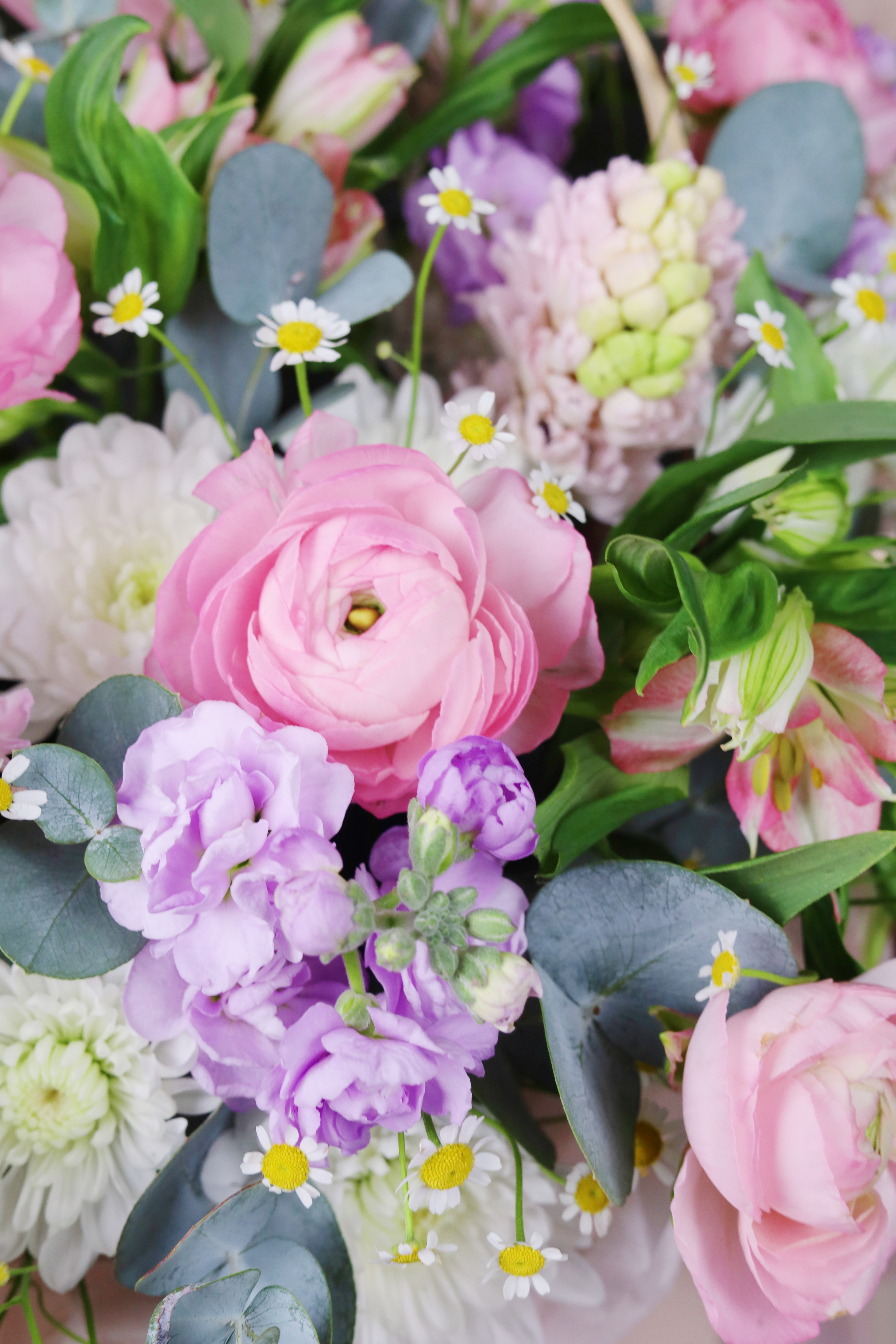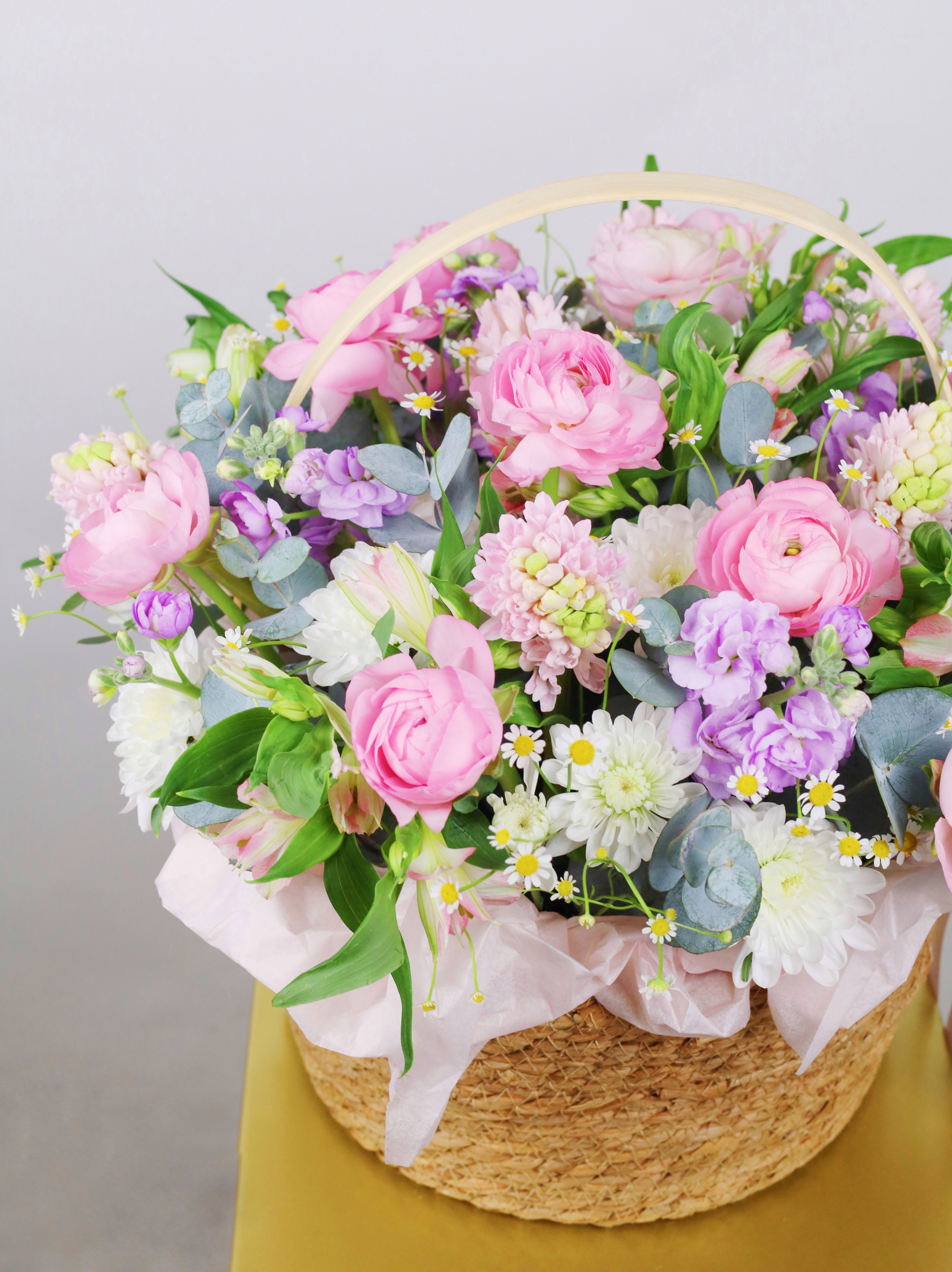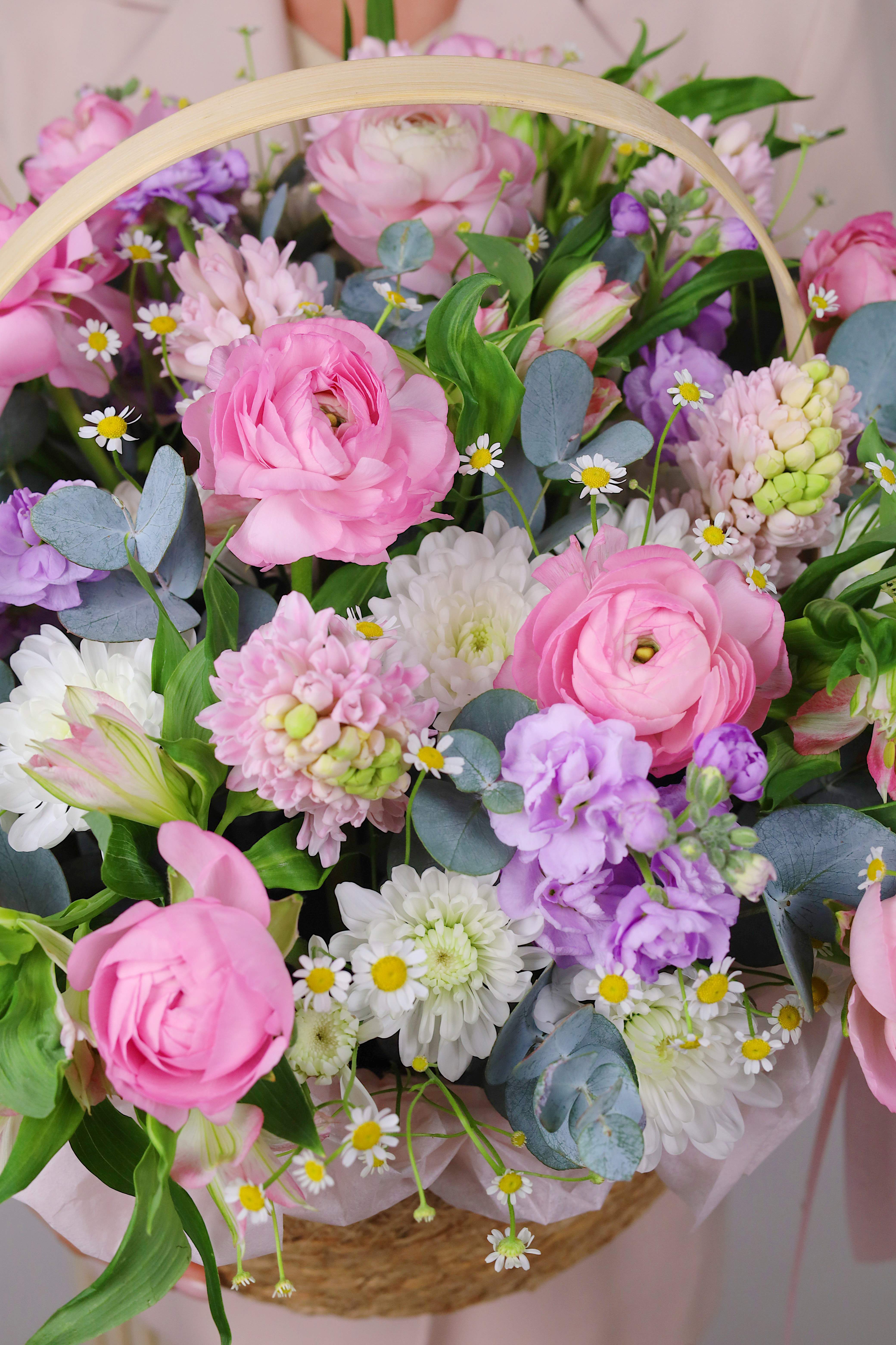КОРЗИНА С РАНУНКУЛЮСАМИ, МАТТИОЛОЙ И ЭВКАЛИПТОМ