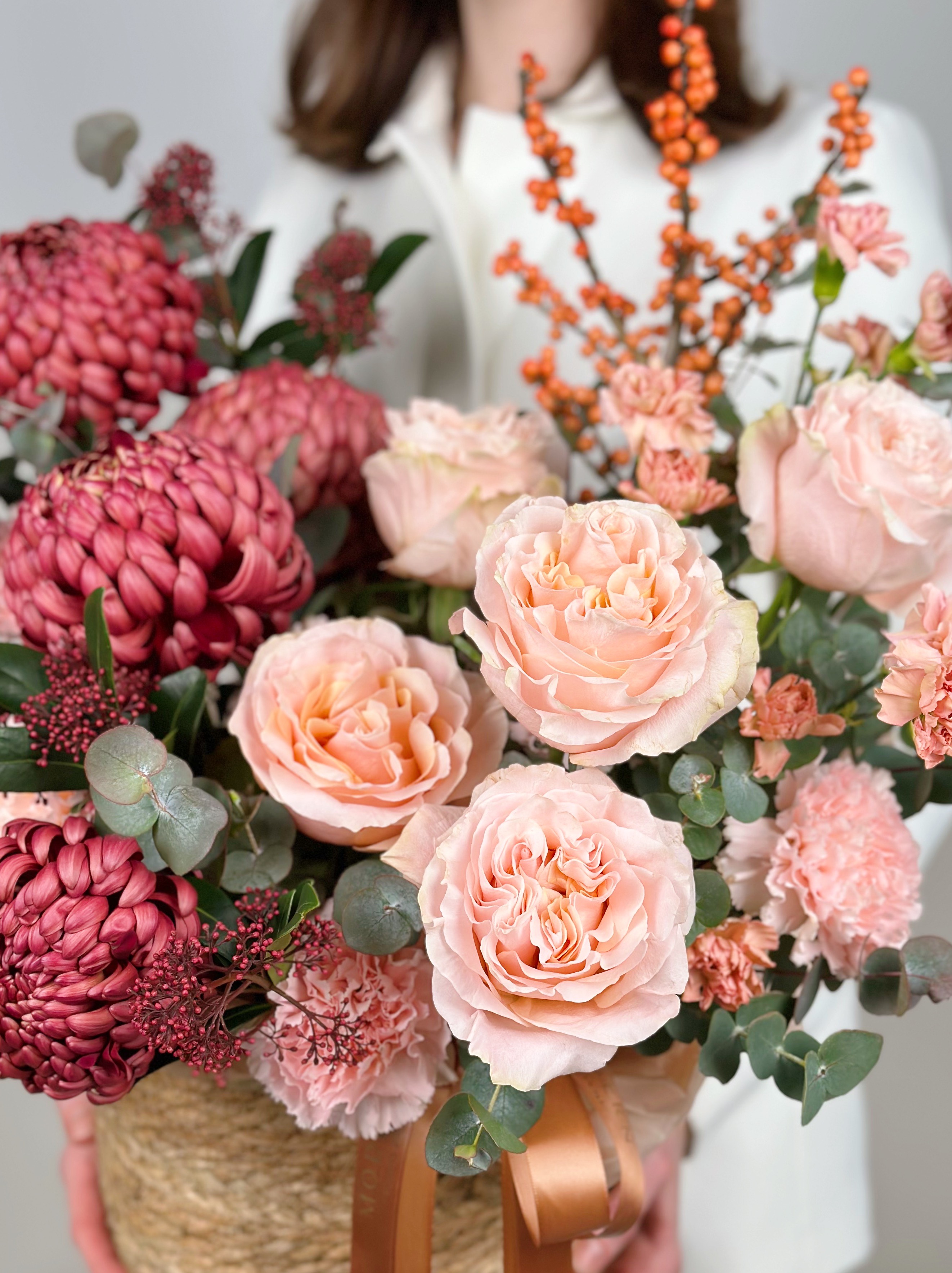 КОРЗИНА В ОСЕННИХ ТОНАХ С ПИОНОВИДНОЙ РОЗОЙ