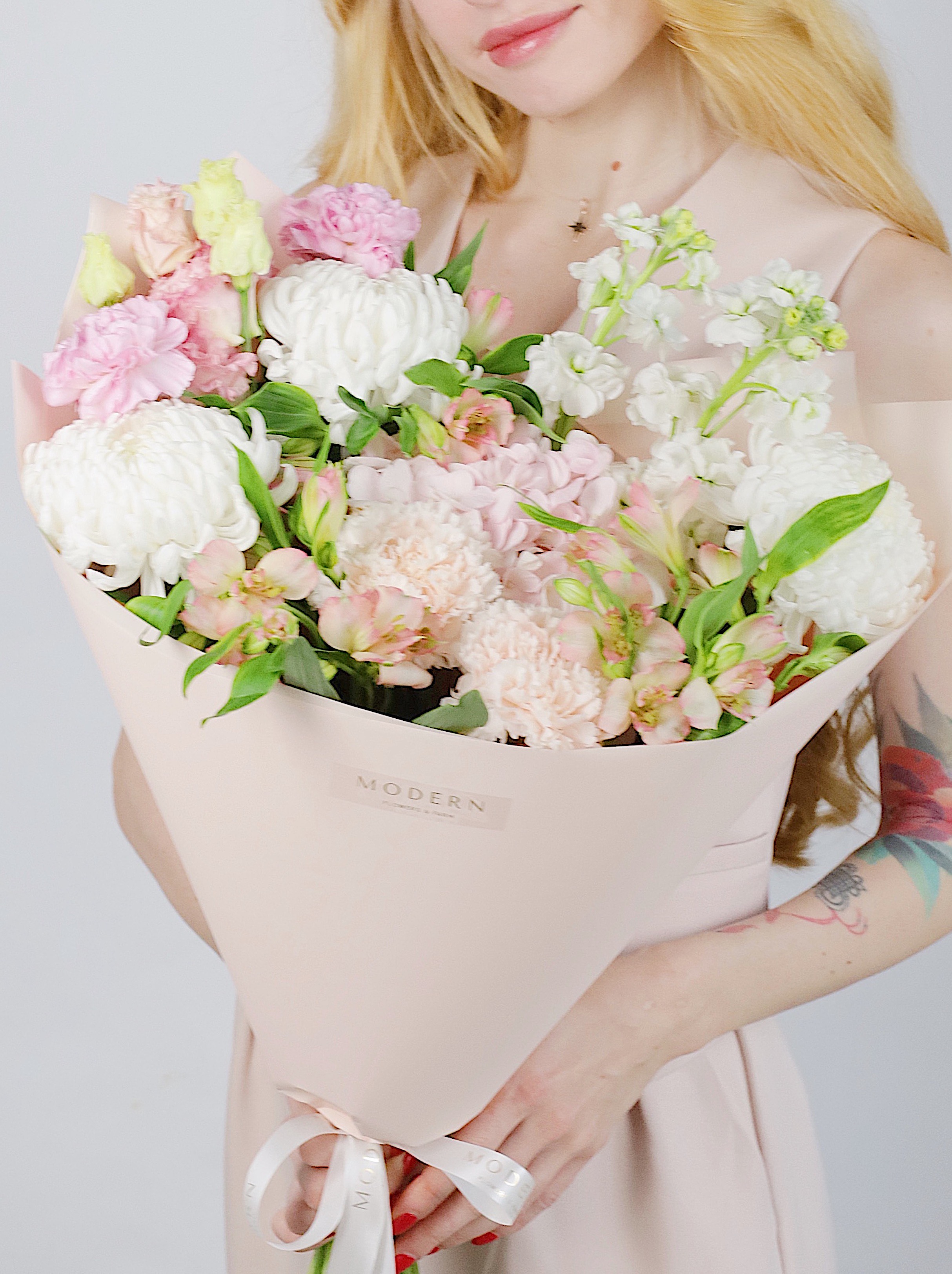 —НЕЖНЫЙ БУКЕТ С ХРИЗАНТЕМОЙ И МАТТИОЛОЙ