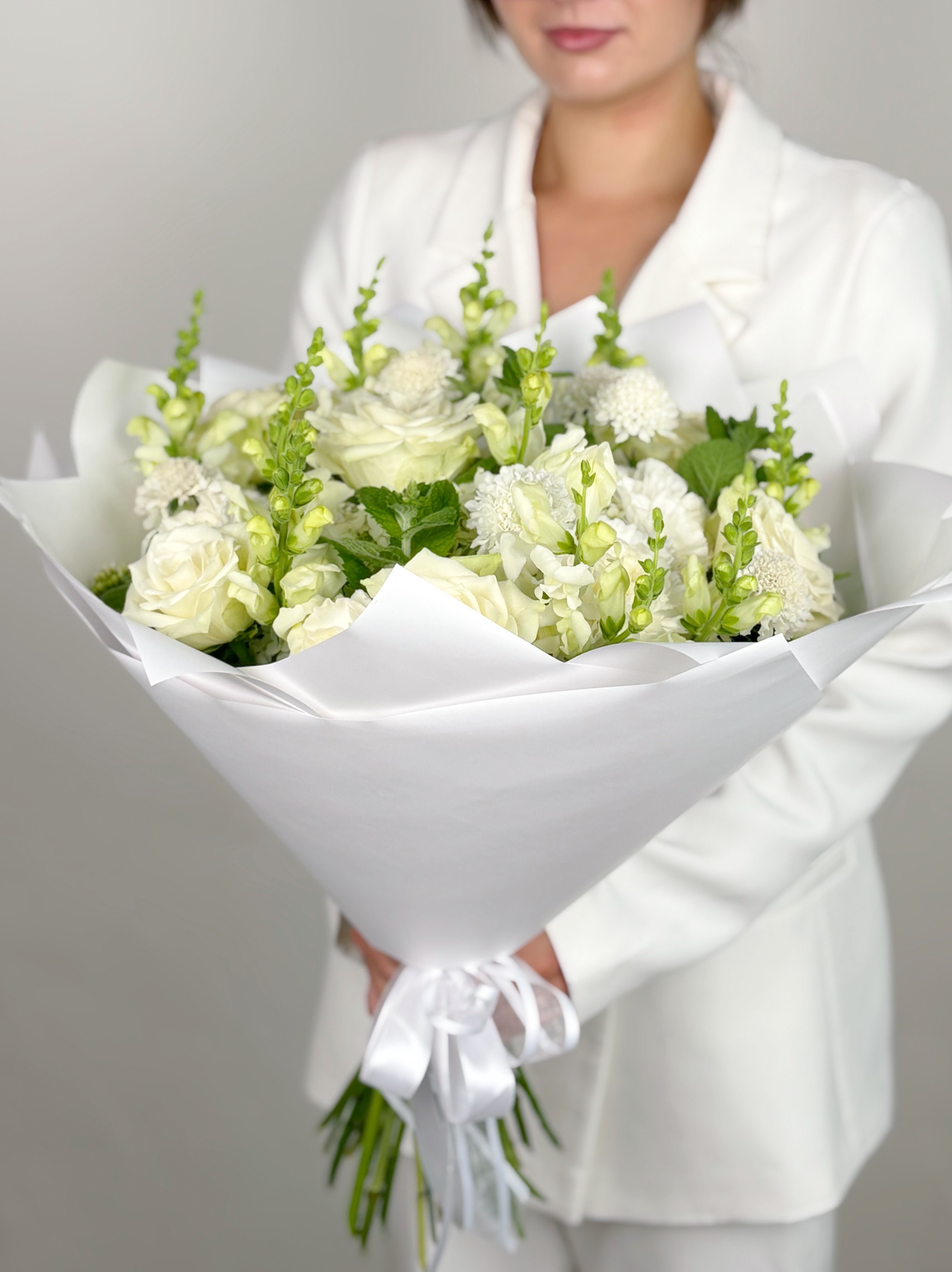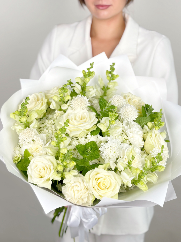 Представляем вашему вниманию воплощение элегантности и утонченности — изысканный букет в белоснежных тонах. В центре композиции — роскошные пионовидные розы и пышные соцветия гортензии, создающие неповторимую симфонию природной красоты.