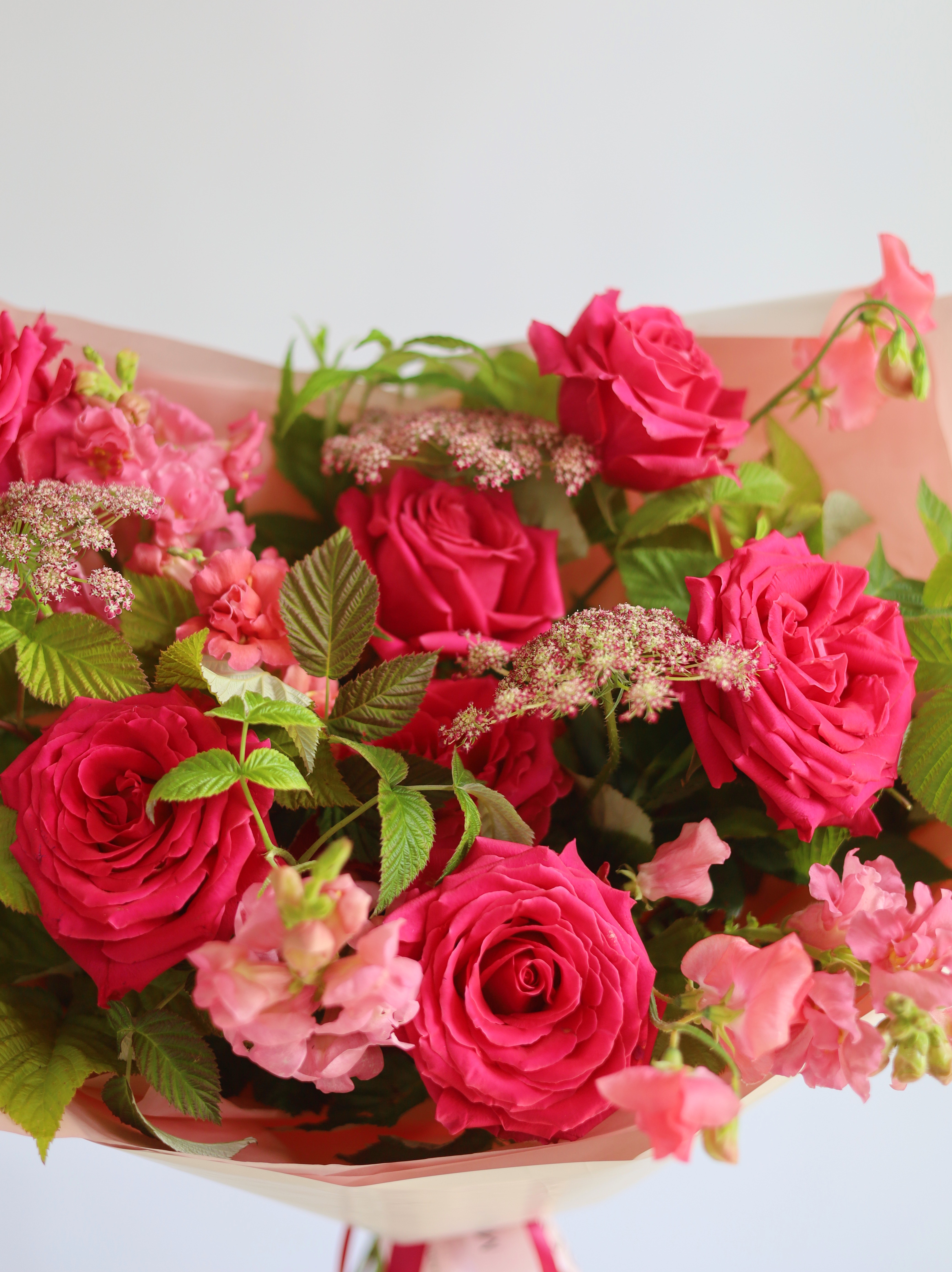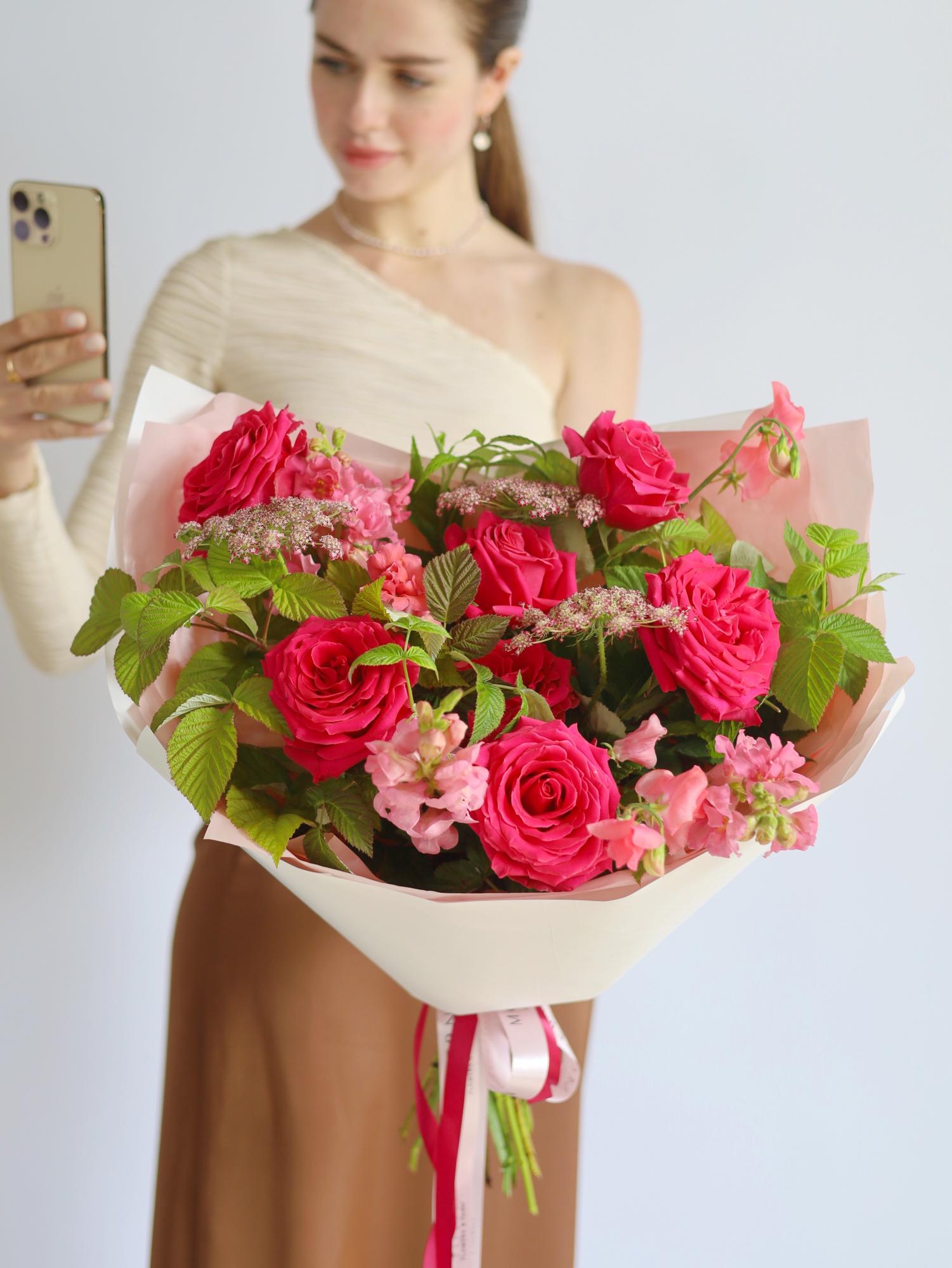 ЯРКИЙ БУКЕТ С ПИОНОВИДНОЙ РОЗОЙ И МАЛИНОЙ